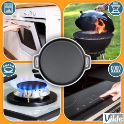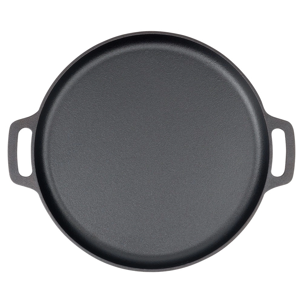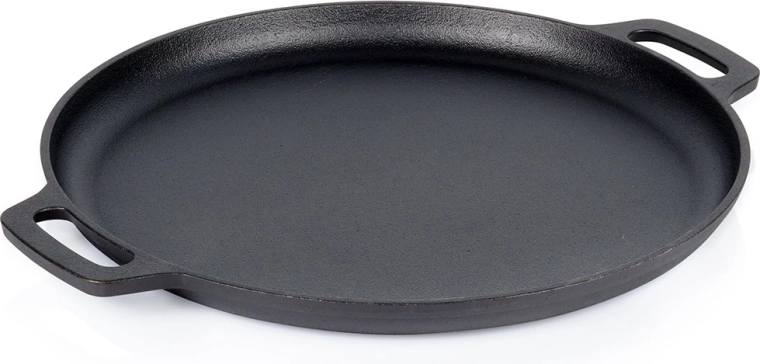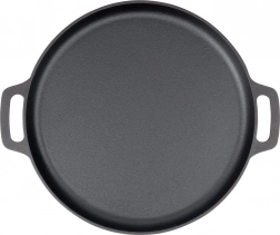 Această tigaie masivă din fontă este un ajutor universal pentru gătitul zilnic acasă, pe grătar și la foc deschis. Datorită suprafeței mari plane și marginii joase, este excelentă pentru fripturi, ouă, clătite, tortilla, cartofi copți și pizza. Două mânere integrate permit transportul sigur și servirea direct pe masă.