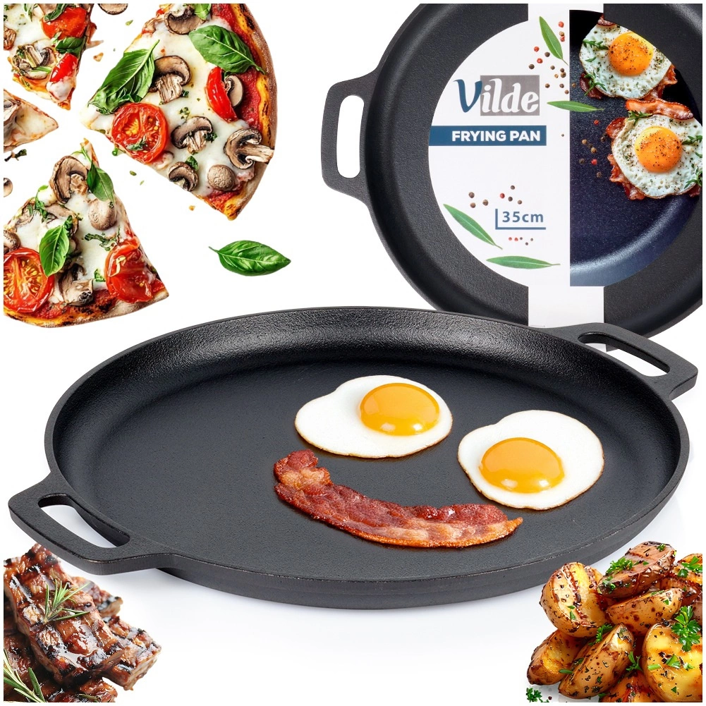 Tigaie rotundă robustă din fontă, cu diametrul de 35 cm și două mânere, ideală pentru prăjire, coacere și înăbușire pe plită, grătar și în cuptor. Fonta asigură distribuție uniformă a căldurii și menținere îndelungată a temperaturii, astfel încât fripturile, cartofii, pizza și legumele vor fi mereu gătite perfect. Potrivită pentru gaz, electric, ceramic, halogen și inducție. Calitate verificată a mărcii VILDE din gama CAST LINE.