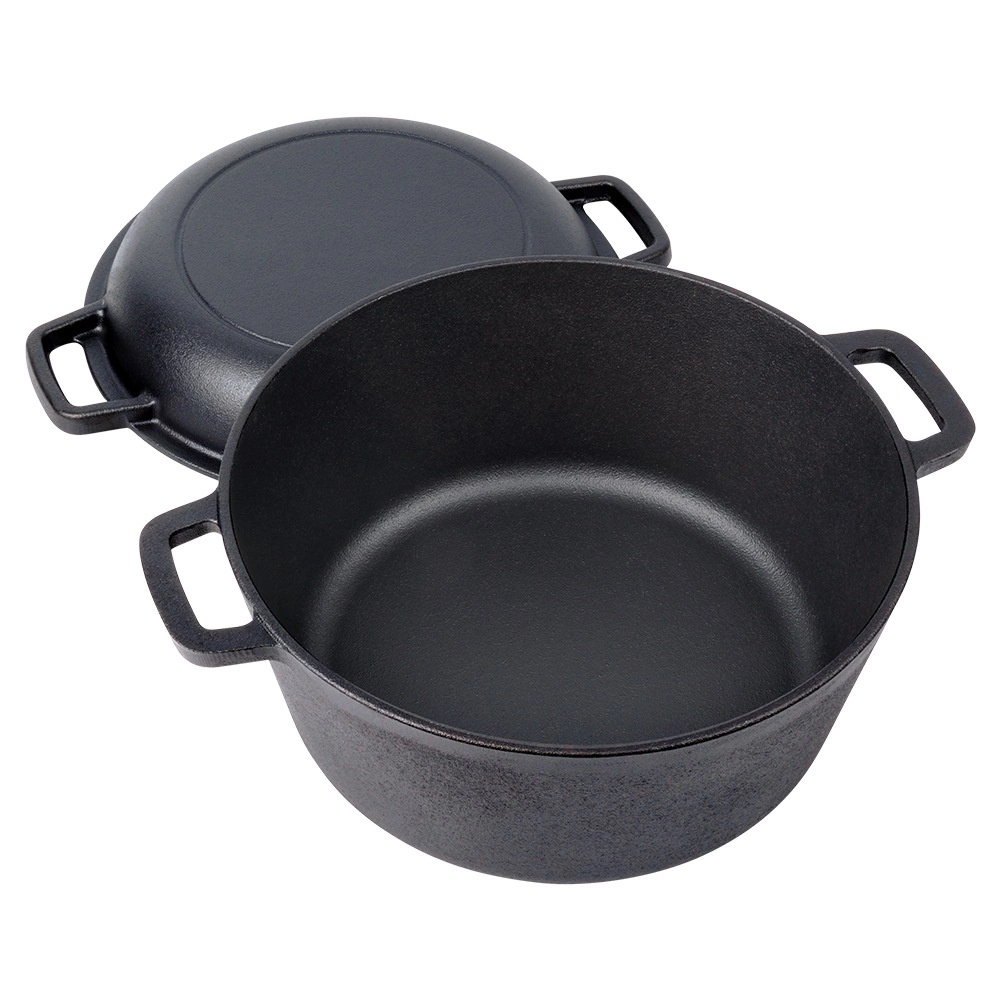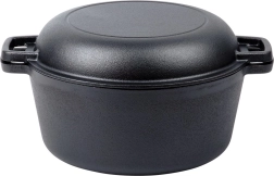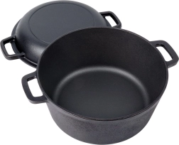 Oală din fontă cu volum de 4,5 l și capac practic (1,6 l), pe care îl poți folosi și ca tigaie joasă sau ca vas de copt. Execuția integral din fontă excelează prin conducerea și păstrarea foarte bună a căldurii, astfel încât preparatele vor fi suculente, coapte uniform și vor rămâne mult timp calde la servire.