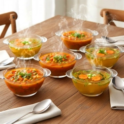 Setul de boluri de sticlă pentru supă, cu volum de 420 ml, este o alegere excelentă atât pentru mesele zilnice, cât și pentru ocazii festive. Sticla transparentă evidențiază culorile și textura preparatelor, astfel încât supele, cremele și deserturile arată întotdeauna apetisant. Datorită formei clasice, bolurile se potrivesc ușor cu orice set de masă.