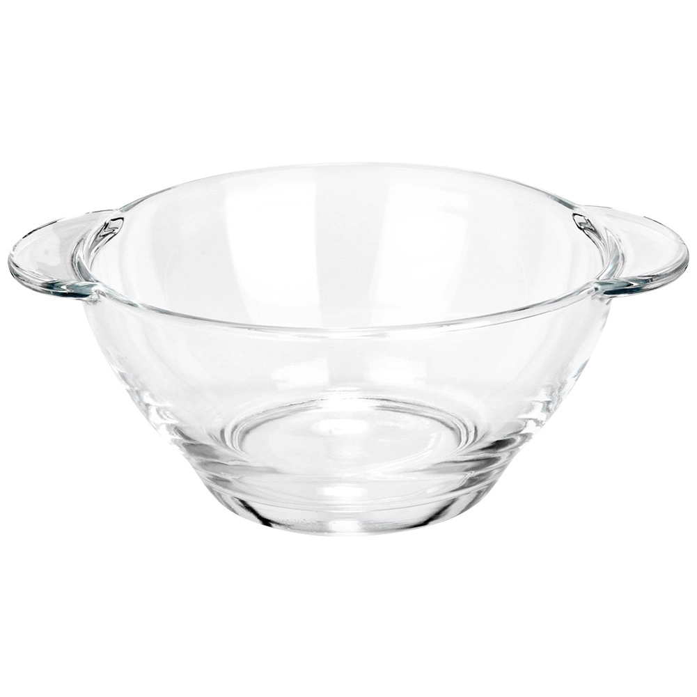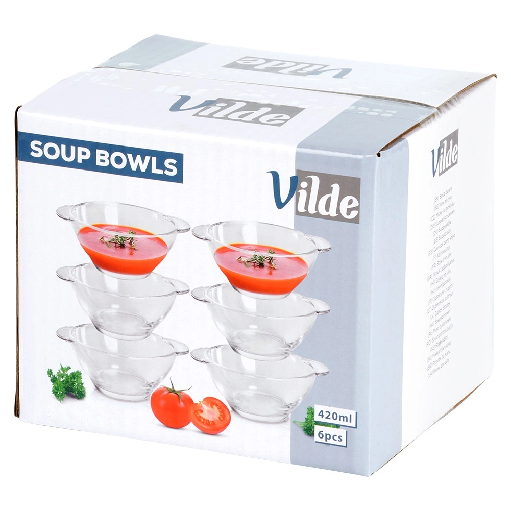 Set elegant de 6 boluri de sticlă pentru supă, cu volum de 420 ml și mânere laterale practice. Ideal pentru servirea supu̦lor, consomé-urilor și cremurilor, dar și a iaurturilor, cerealelor, fructelor și deserturilor. Sticla transparentă și rezistentă asigură o prezentare frumoasă a preparatelor, bolurile sunt potrivite pentru mașina de spălat vase și, datorită mânerelor confortabile, se transportă ușor.