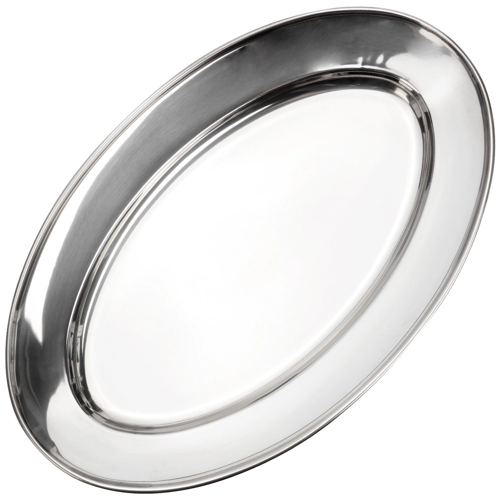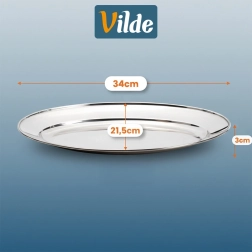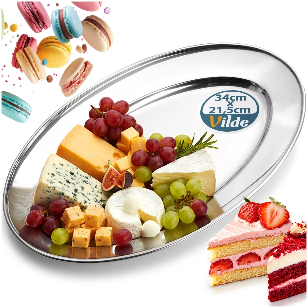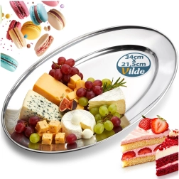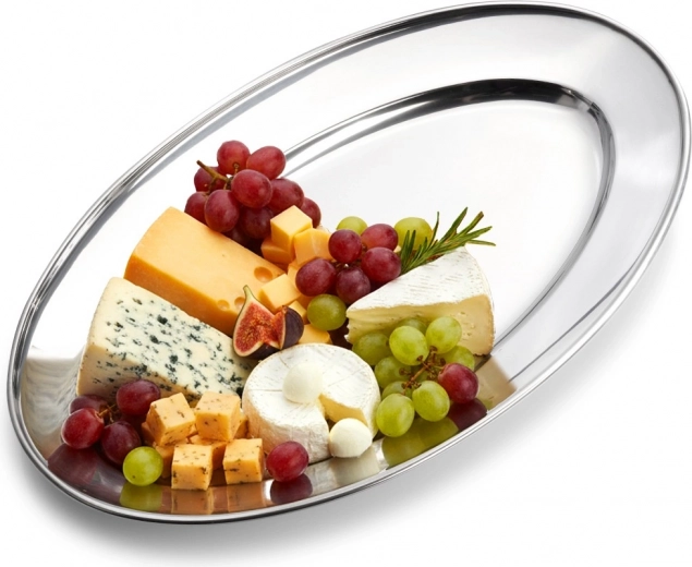 Tavă ovală elegantă din oțel inoxidabil cu dimensiunile 34 × 21,5 × 3 cm, ideală pentru servirea aperitivelor, brânzeturilor, fructelor și deserturilor. Datorită suprafeței lustruite și rezistenței ridicate, se potrivește perfect atât pentru uz casnic, cât și pentru gastronomie, oferind un aspect atemporal și stilat pe orice masă.