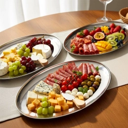 Tavă ovală de servire, stilată, din oțel inoxidabil de calitate, cu o suprafață lucioasă ușor de spălat și cu o margine practică pentru transport sigur. Este o alegere excelentă pentru utilizarea zilnică și pentru ocazii festive – de la brunch până la reuniuni de familie.