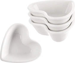 Set elegant de patru castronașe albe în formă de inimă, din porțelan, cu volum de 35 ml și dimensiuni 7,5 × 7,5 × 2,5 cm. Ideale pentru servirea snackurilor, dipurilor și sosurilor și mini deserturilor. Rezistente la temperaturi de până la 200 °C, potrivite pentru cuptor, microunde și mașina de spălat vase. Designul clasic alb se potrivește oricărei gospodării și gastronomii.