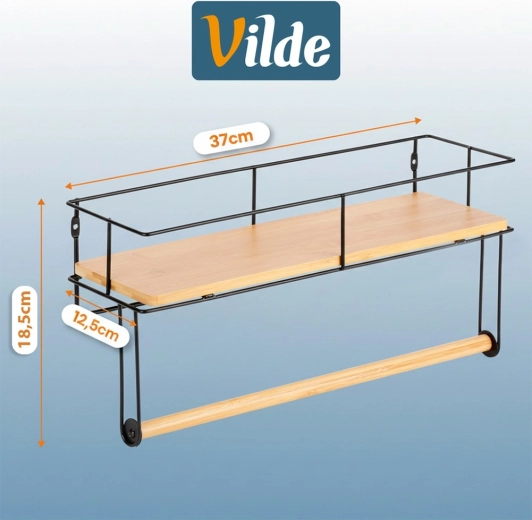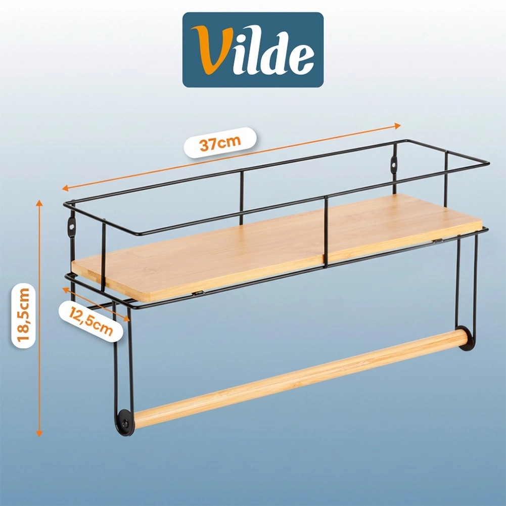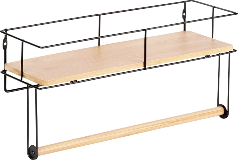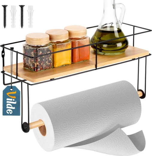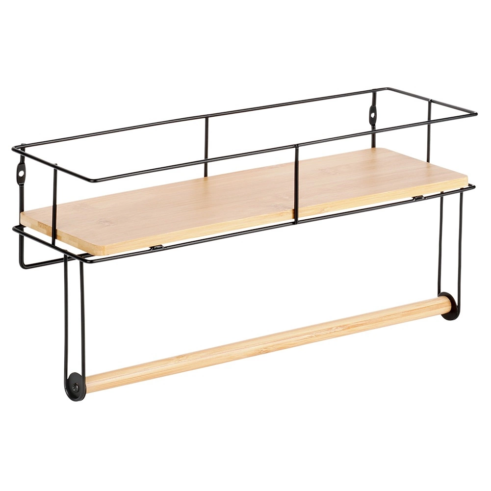 Suportul de perete practic cu raft păstrează bucătăria ordonată și totul la îndemână. Oferă suport pentru prosoape de hârtie, raft pentru condimente și mărunțișuri, construcție metalică solidă cu vopsea pulbere și montaj ușor pe perete. Elemente din lemn de bambus pentru un aspect elegant.