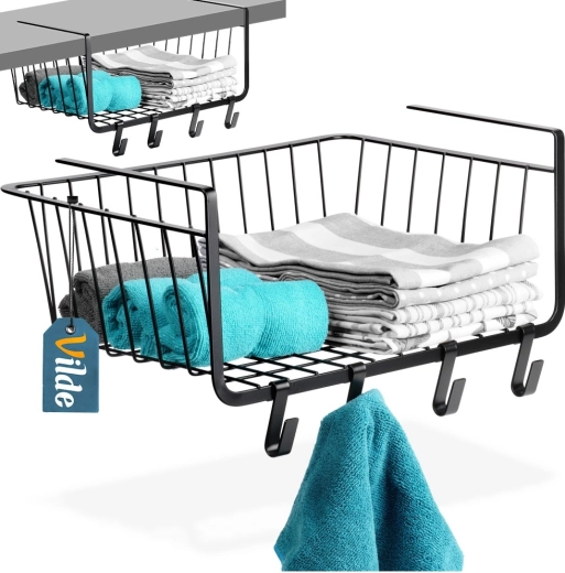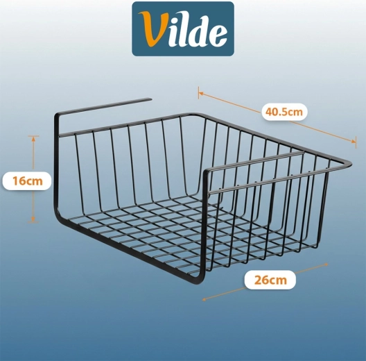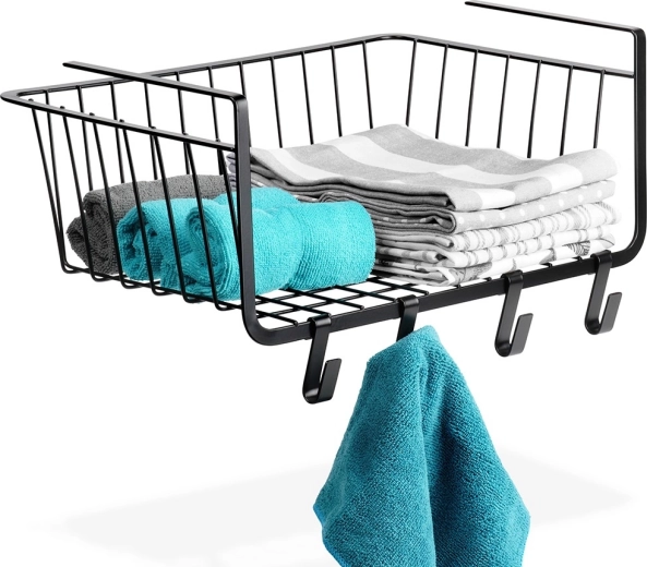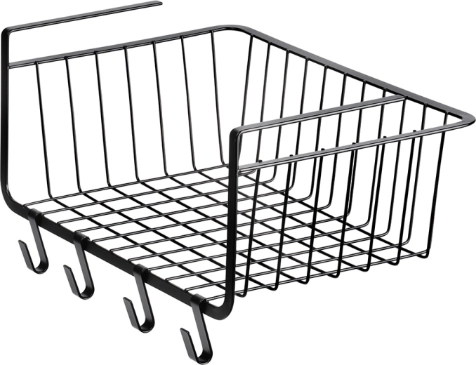 Coșul practic suspendat sub poliță, cu dimensiunile 40,5 × 26 × 16 cm, extinde spațiul de depozitare fără găurire. Include patru cârlige pentru agățarea prosoapelor sau accesoriilor. Coșul este din metal rezistent, în culoare neagră, are utilizare universală în bucătărie, baie, dressing și birou și permite instalare rapidă, fără unelte.