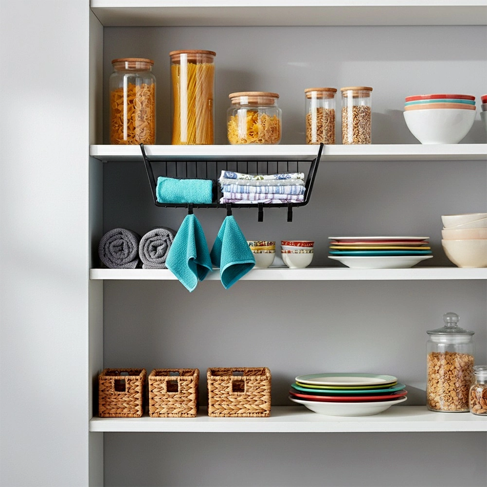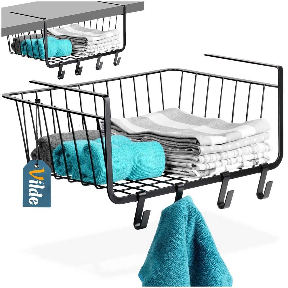 Organizează-ți locuința inteligent și fără găurire. Coșul suspendat se glisează ușor sub poliță sau pe bara unei dulapuri și oferă imediat spațiu suplimentar de depozitare pentru aranjarea clară a ustensilelor de bucătărie, accesoriilor de baie sau textilelor. Pachetul include 4 cârlige practice pentru agățarea prosoapelor, mănușilor de bucătărie sau a accesoriilor mici.