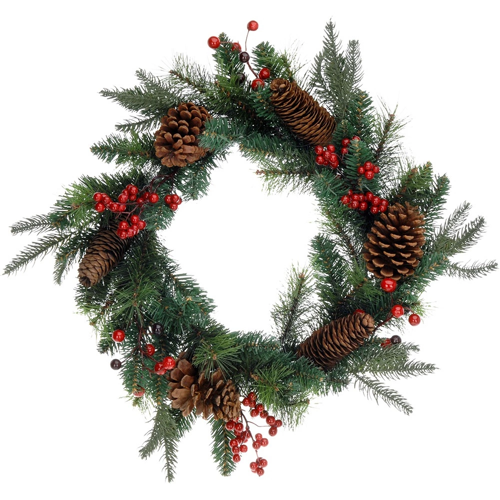 Coroniță clasică de Crăciun, cu diametrul de 45 cm, din ace artificiale realiste, bogat decorată cu conuri și crenguțe cu bobițe roșii. Ideală pentru ușă, perete sau ca decorațiune centrală pe masă. Aspect realist, execuție durabilă și design festiv atemporal pentru o atmosferă caldă de Crăciun.