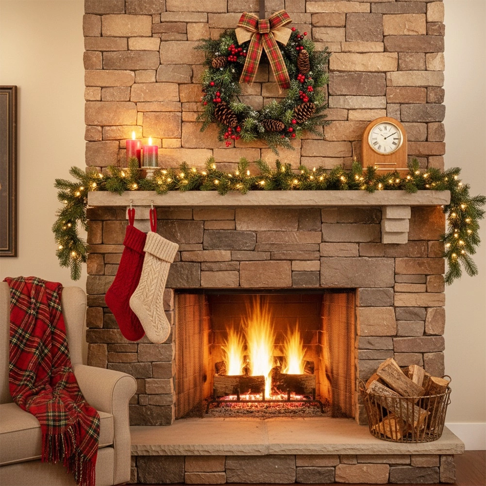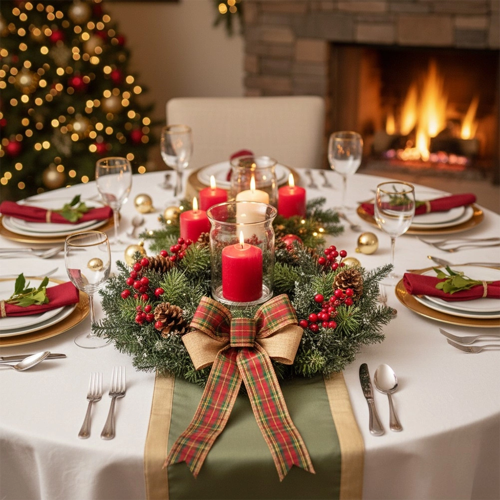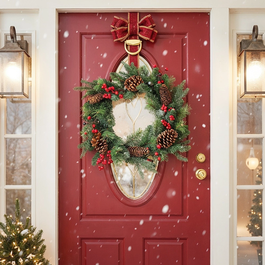 - Decorațiune bogată – conuri și crenguțe cu bobițe pentru un stil clasic de Crăciun.