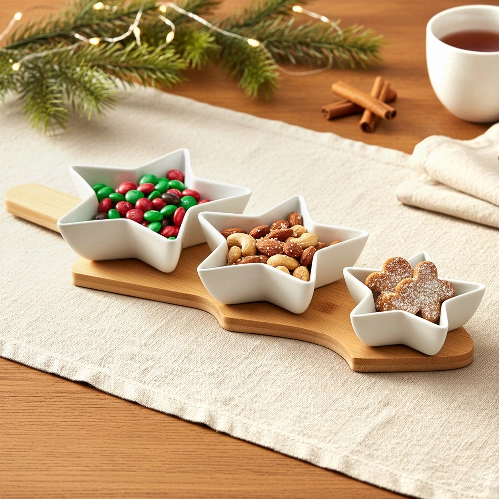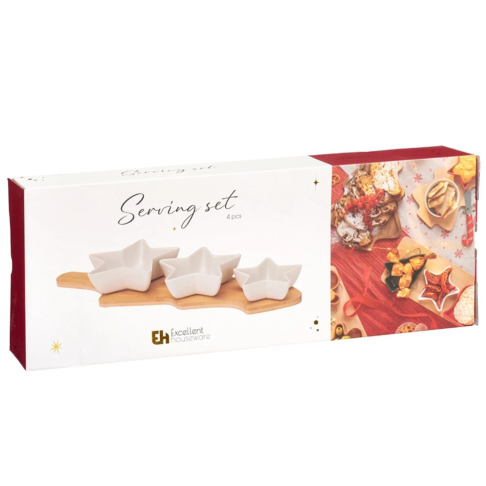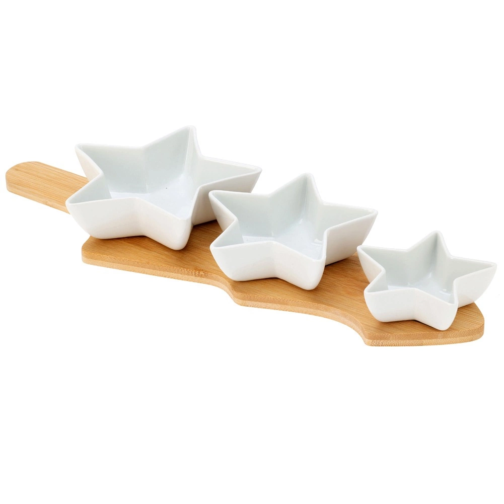 Set elegant din 4 piese pentru servire, cu boluri din porțelan în formă de stea și tavă din bambus în formă de brăduț. Ideal pentru servire rafinată de nuci, măsline, sosuri și mici delicatese. Porțelan de calitate alb și bambus natural creează o combinație armonioasă care înfrumusețează orice masă festivă.