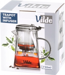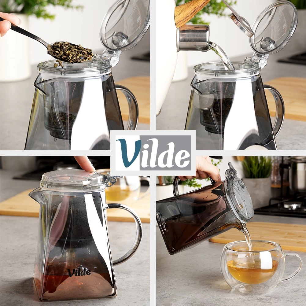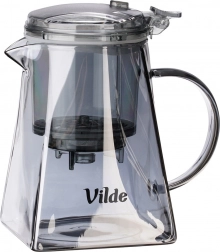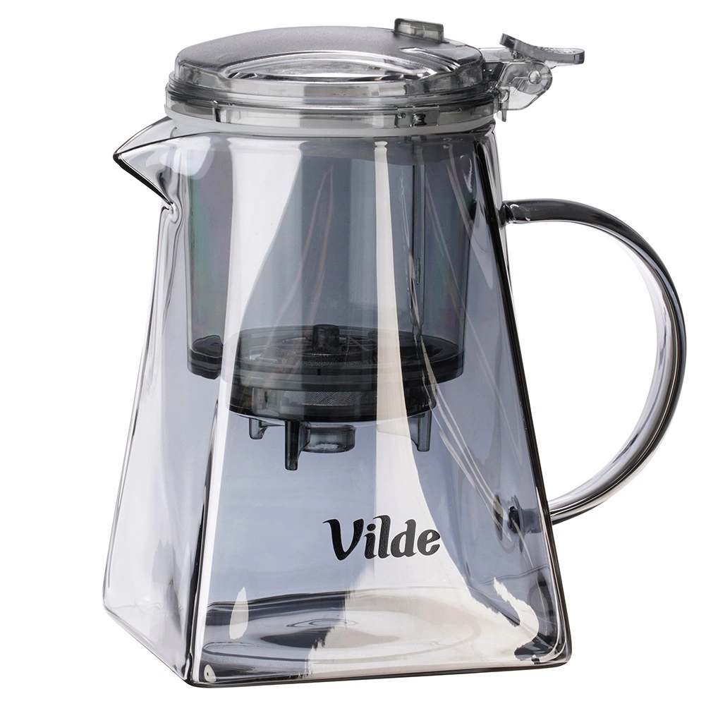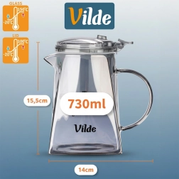 Corpul din sticlă de borosilicat este ușor, rezistent și stabil termic. Baza pătrată cu formă conică oferă stabilitate și un aspect original. Capacul practic și infuzorul din plastic de calitate sunt transparente, în nuanță gri fumuriu. Gura largă facilitează umplerea și curățarea, iar mânerul ergonomic permite turnarea comodă.