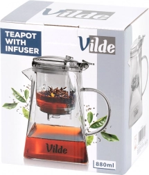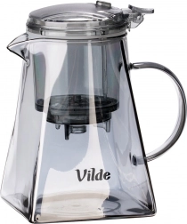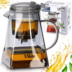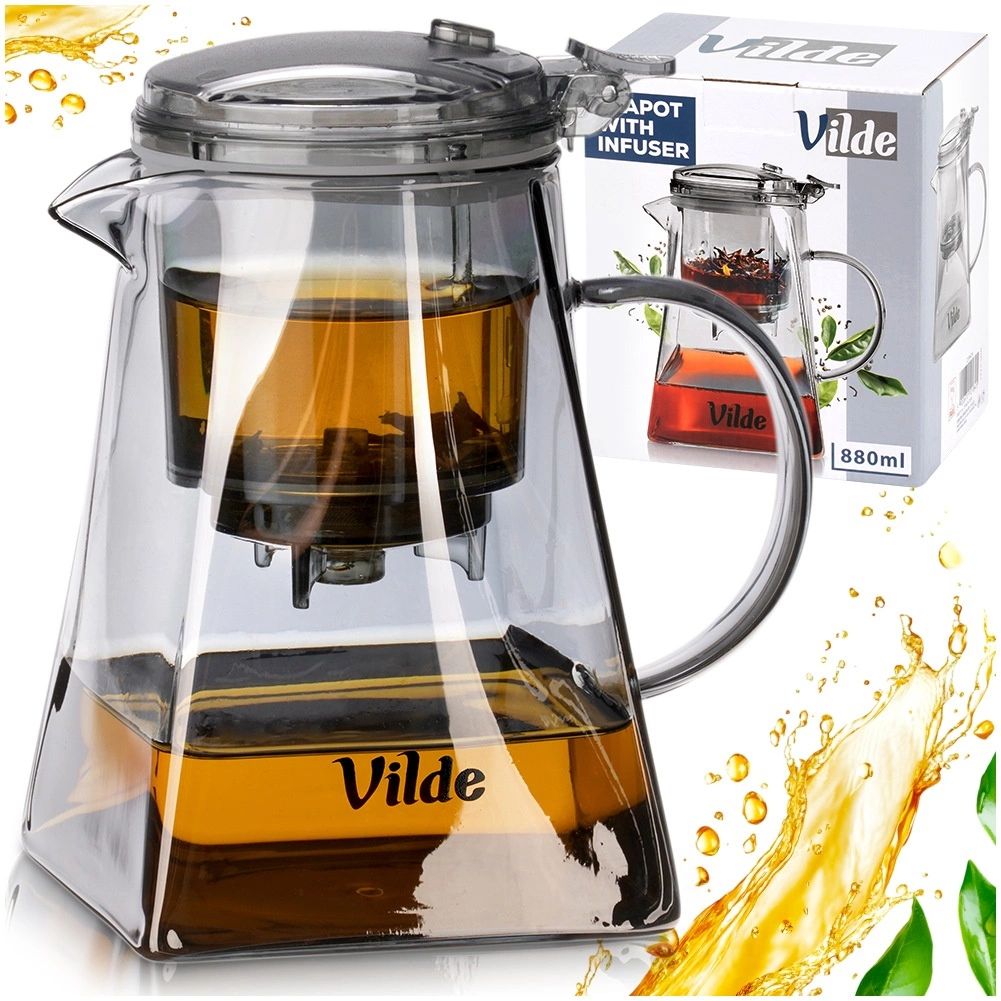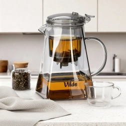 Carafa este realizată din sticlă borosilicată rezistentă la căldură, în timp ce infuzorul și capacul sunt din plastic durabil, cu nuanță transparentă fumurie. Deschiderea largă facilitează turnarea și curățarea, iar mânerul ergonomic asigură manipulare sigură. Baza pătrată oferă carafei un aspect original și stabilitate pe masă.