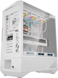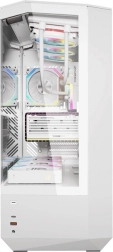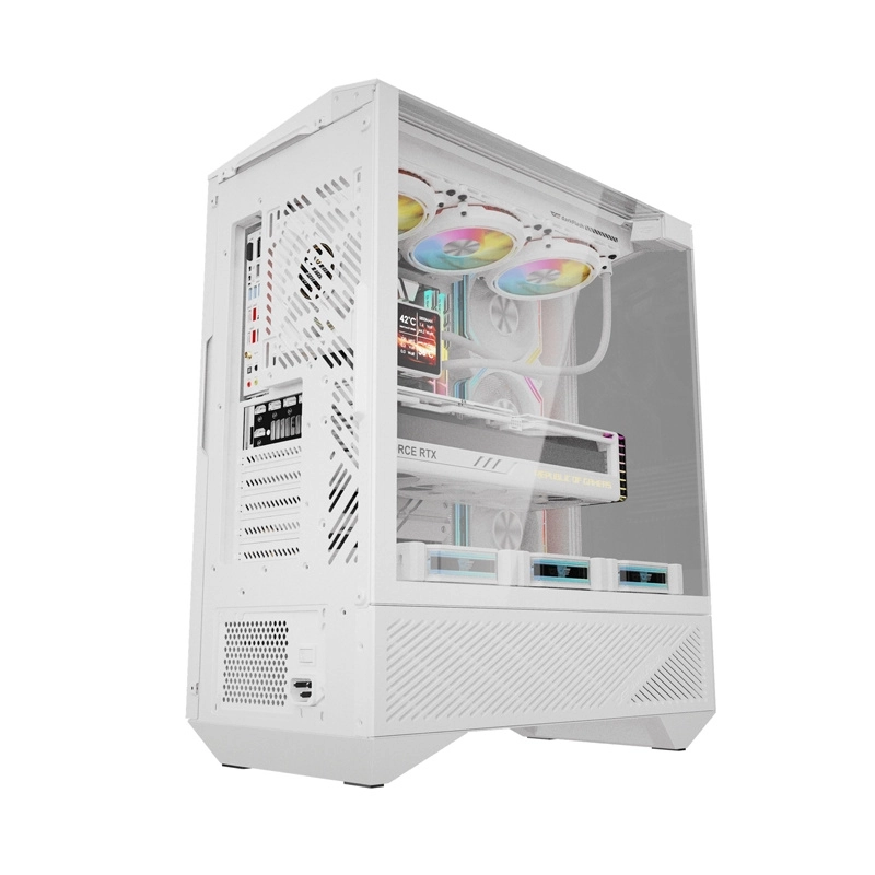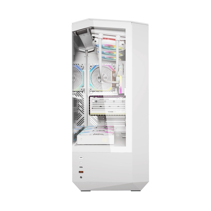 Vedere panoramică de 330° care evidențiază designul configurației tale. Pachetul include 4 ventilatoare ARGB pentru efect vizual imediat și răcire eficientă.