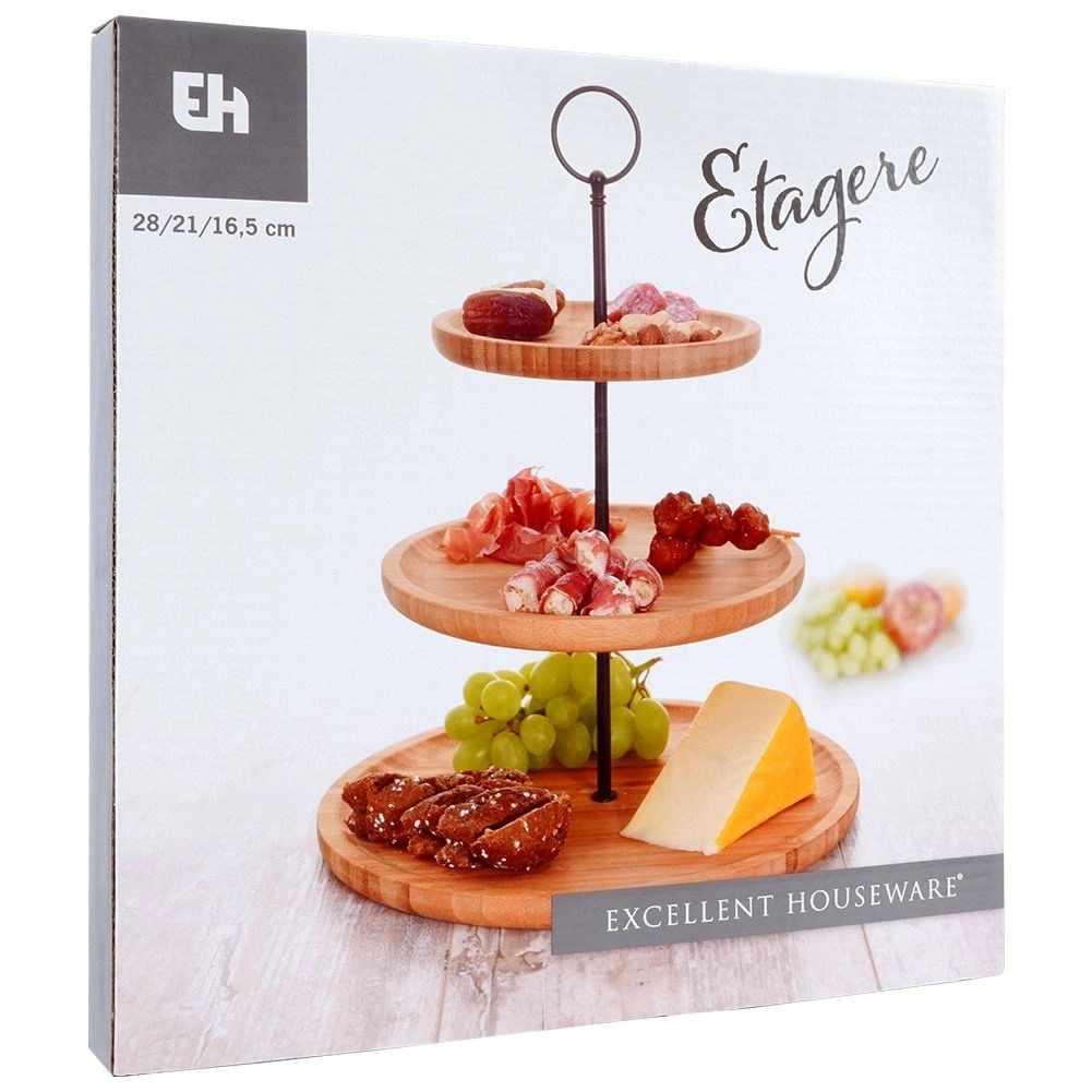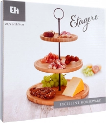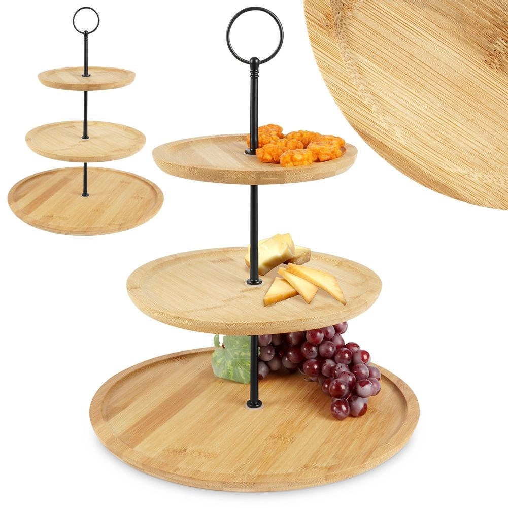 Platou etajat elegant din bambus, cu înălțimea de 35 cm, oferă o prezentare spectaculoasă a deserturilor, fructelor și gustărilor. Datorită celor trei niveluri cu diametre diferite, obții mai mult spațiu pe masă și o vizibilitate excelentă. Lemnul de bambus natural, combinat cu elemente metalice solide, arată stilat și este ideal atât pentru uz casnic, cât și profesional.