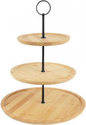 Suportul este format din trei tăvi rotunde cu diametre diferite, care creează un display armonios și bine organizat. Bambusul natural este un lemn ușor, durabil și igienic, iar conexiunile metalice asigură stabilitatea. Pentru o durată de viață îndelungată, recomandăm curățarea manuală și evitarea spălării în mașina de spălat vase.