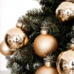 Setul combină globuri aurii lucioase și mate, care împreună creează un joc echilibrat de lumină și texturi pe bradul tău.