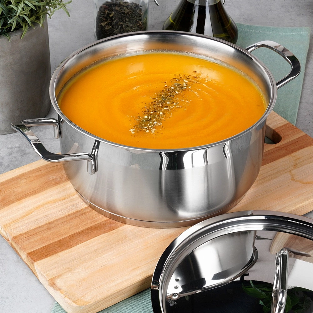 Oala premium din inox din gama ANETT este o alegere excelentă pentru supe, paste și pentru înăbușire delicată. Oțelul inoxidabil de calitate 18/10 cu finisaj mat și o bandă lustruită elegantă în partea superioară asigură durabilitate îndelungată și un aspect atemporal. Pereți groși și execuție robustă garantează stabilitate și rezistență la utilizare zilnică.