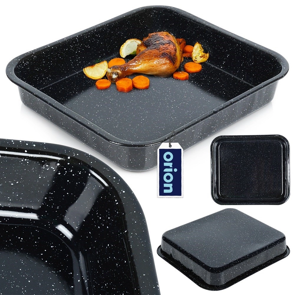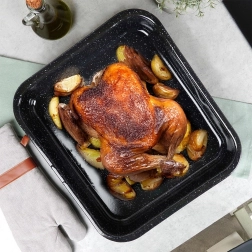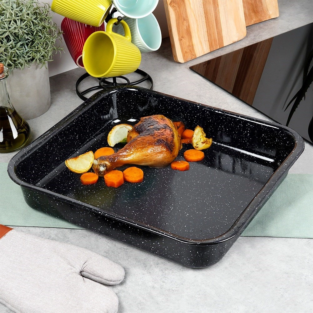 Tavă rezistentă și universală, din oțel smălțuit de calitate, de culoare neagră, o alegere excelentă pentru gătirea zilnică. Datorită volumului generos de 8 l și dimensiunilor interioare de 38 × 34 × 7 cm, puteți pregăti cu ușurință fripturi, legume, pizza de casă cu margine înaltă sau mâncăruri gratinate consistente. Suprafața emailată este prietenoasă cu sănătatea și potrivită și pentru persoanele alergice.