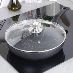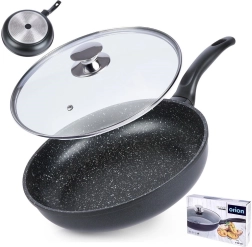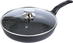 Tigaia cu pereți groși, din turnare de aluminiu, se remarcă prin construcția masivă pentru conducerea stabilă a căldurii și durată lungă de viață. Stratul antiaderent tip piatră/granit facilitează prăjirea și înăbușirea, reduce consumul de ulei și permite curățarea ușoară. Capacul de sticlă cu supapă de abur ajută la menținerea umidității și la controlul procesului de gătire.