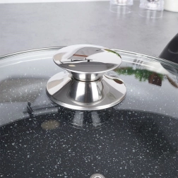 Tigaie robustă din granit, cu diametrul de 28 cm, cu capac de sticlă pentru gătit zilnic. Datorită suprafeței antiaderente fără PFOA și PTFE pregătiți mâncăruri cu cantitate minimă de grăsime, căldura se distribuie uniform, iar mânerul ergonomic rămâne rece la atingere. Potrivită pentru toate tipurile de plite, inclusiv inducție și pentru mașina de spălat vase.