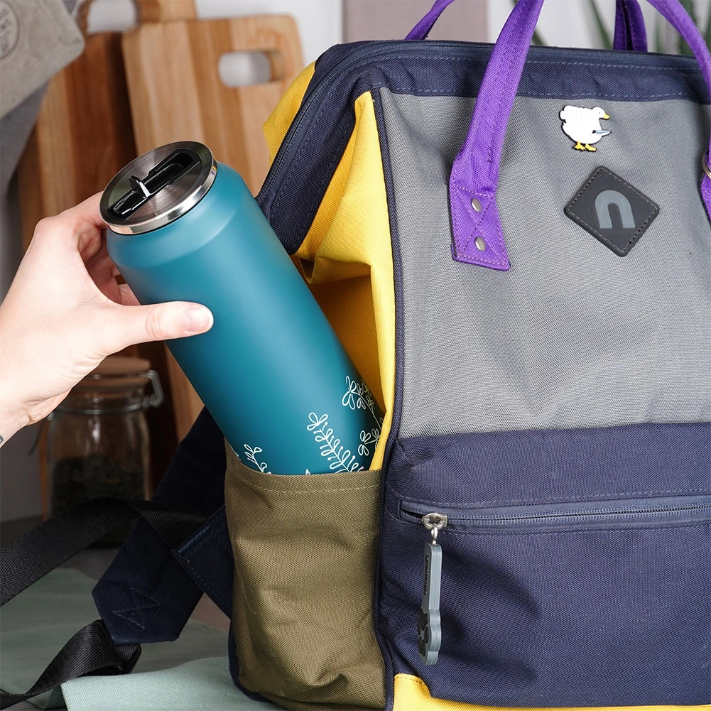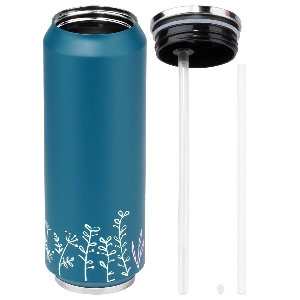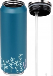 Capacul ergonomic cu muștiuc rabatabil și pai integrat permite băutul confortabil fără a înclina cana – ideală pentru călătorii, la serviciu și în excursii. Decorul vegetal stilat pe fundal albastru subliniază aspectul elegant și face din cană o idee excelentă de cadou.
