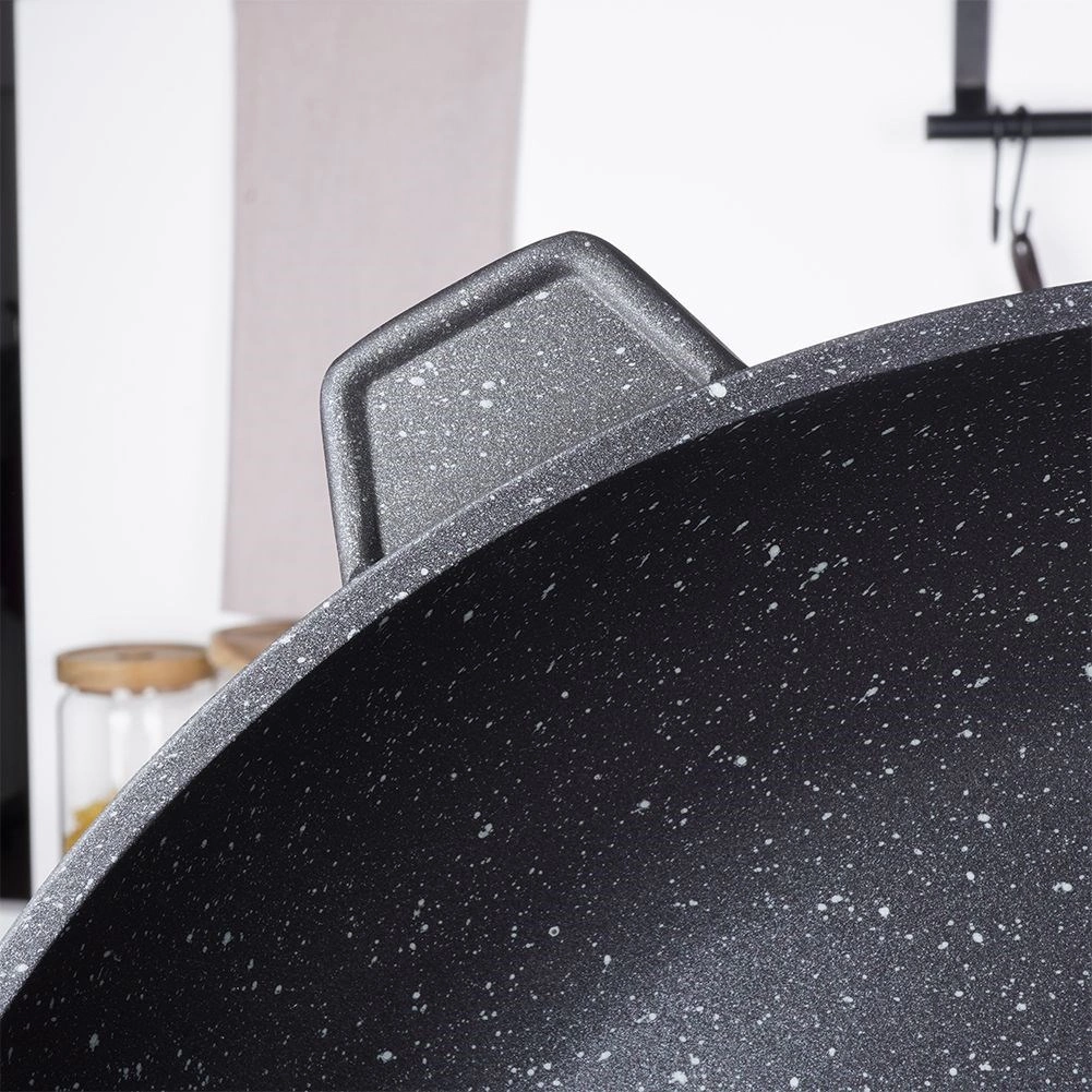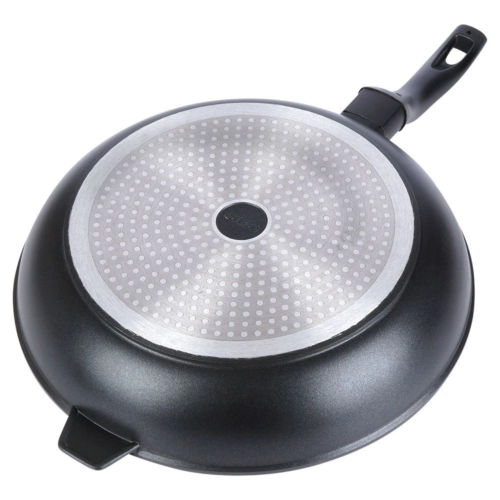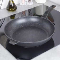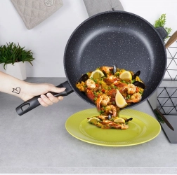 Tigaia din granit din gama Grande îmbină corpul masiv din aluminiu cu stratul antiaderent durabil Pfluon Granit pentru gătit mai sănătos, fără lipire. Conducția eficientă a căldurii scurtează timpul de preparare și economisește energie, în timp ce mânerul ergonomic rămâne rece și se ține confortabil.