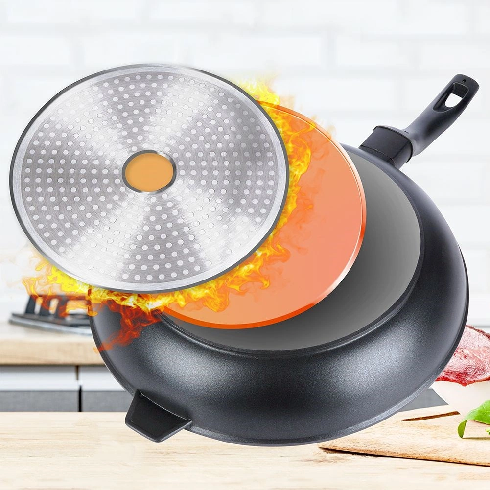 Fundul multistrat cu placă de inducție asigură transfer eficient al căldurii și compatibilitate cu gaz, electric, vitroceramică, halogen și inducție.
