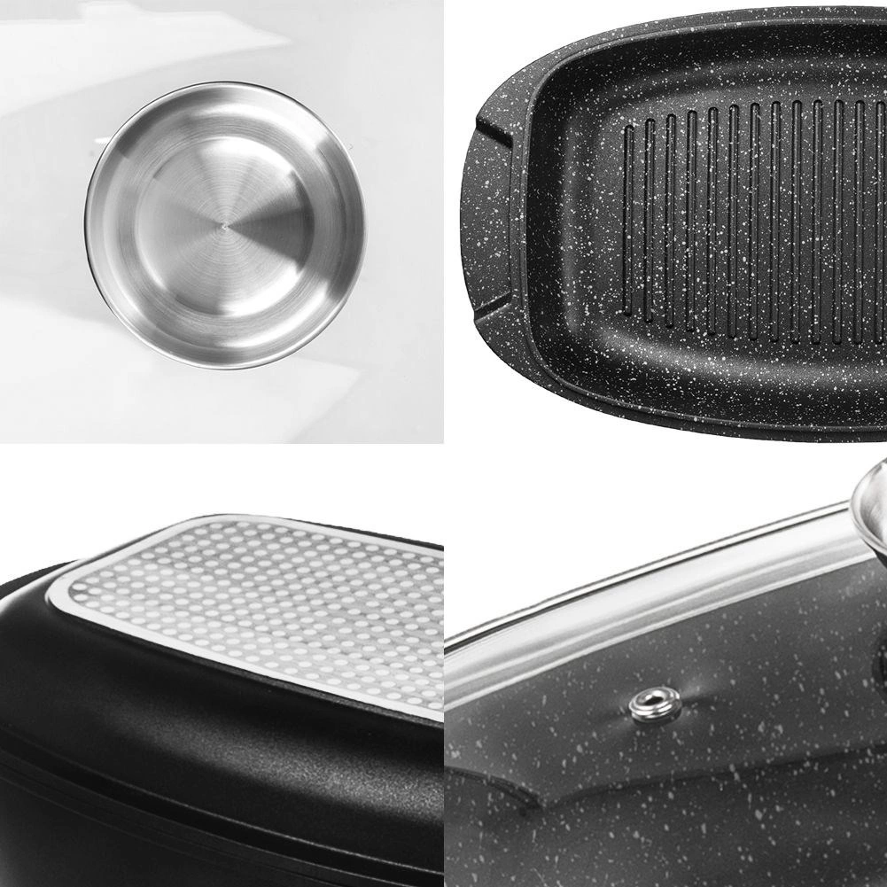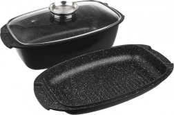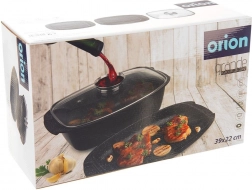Conținutul pachetului: 1× tavă adâncă dreptunghiulară (exterior 39 × 22 × 10 cm; interior 32 × 21 × 9,5 cm; 5 l), 1× tigaie-grătar/capac (exterior 39 × 22 × 5 cm; interior 31 × 20 × 4 cm; 2 l), 1× capac din sticlă (exterior 34 × 22,5 × 6,5 cm). ORION – produs original fabricat conform standardelor europene.