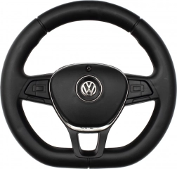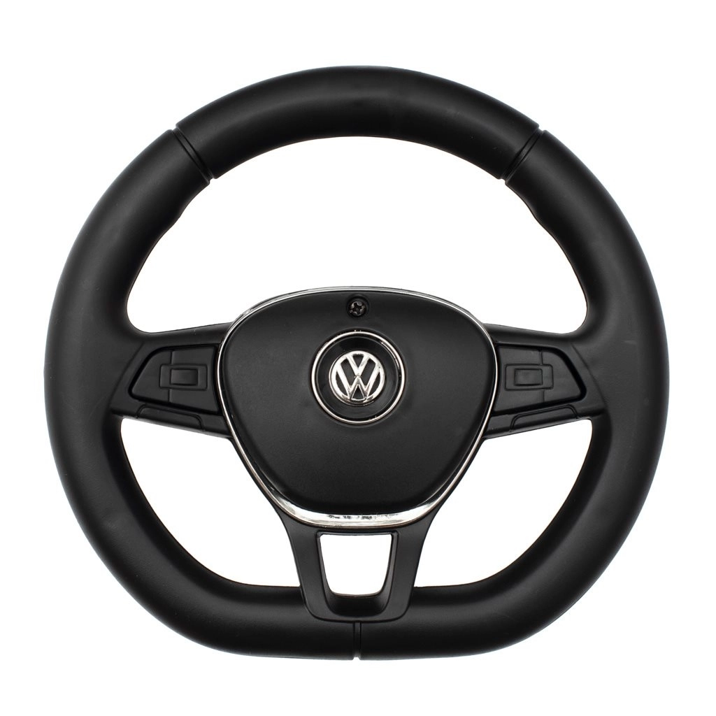 Pentru copiii mai mici, tija de ghidare permite controlul ușor de către părinte, iar pentru cei mai mari există opțiunea deplasării independente prin împingere. Volanul cu trei spițe, cu logo VW, are claxon și melodii vesele (alimentare 2× AA, neincluse). Cutia de depozitare de sub șezut este practică pentru mărunțișuri, iar suporturile pentru picioare rabatabile și cotierele detașabile sporesc confortul.