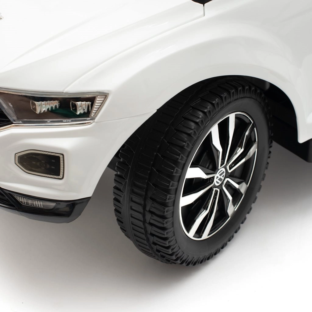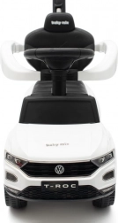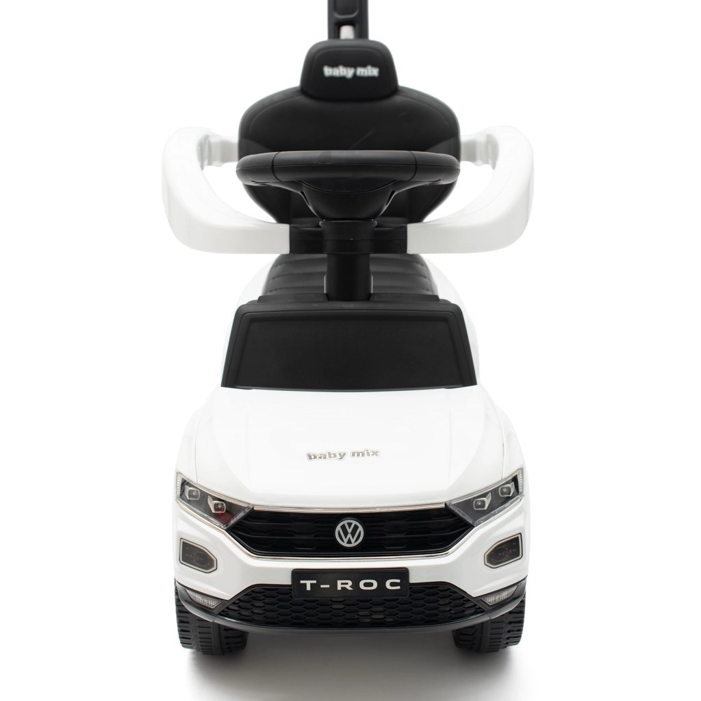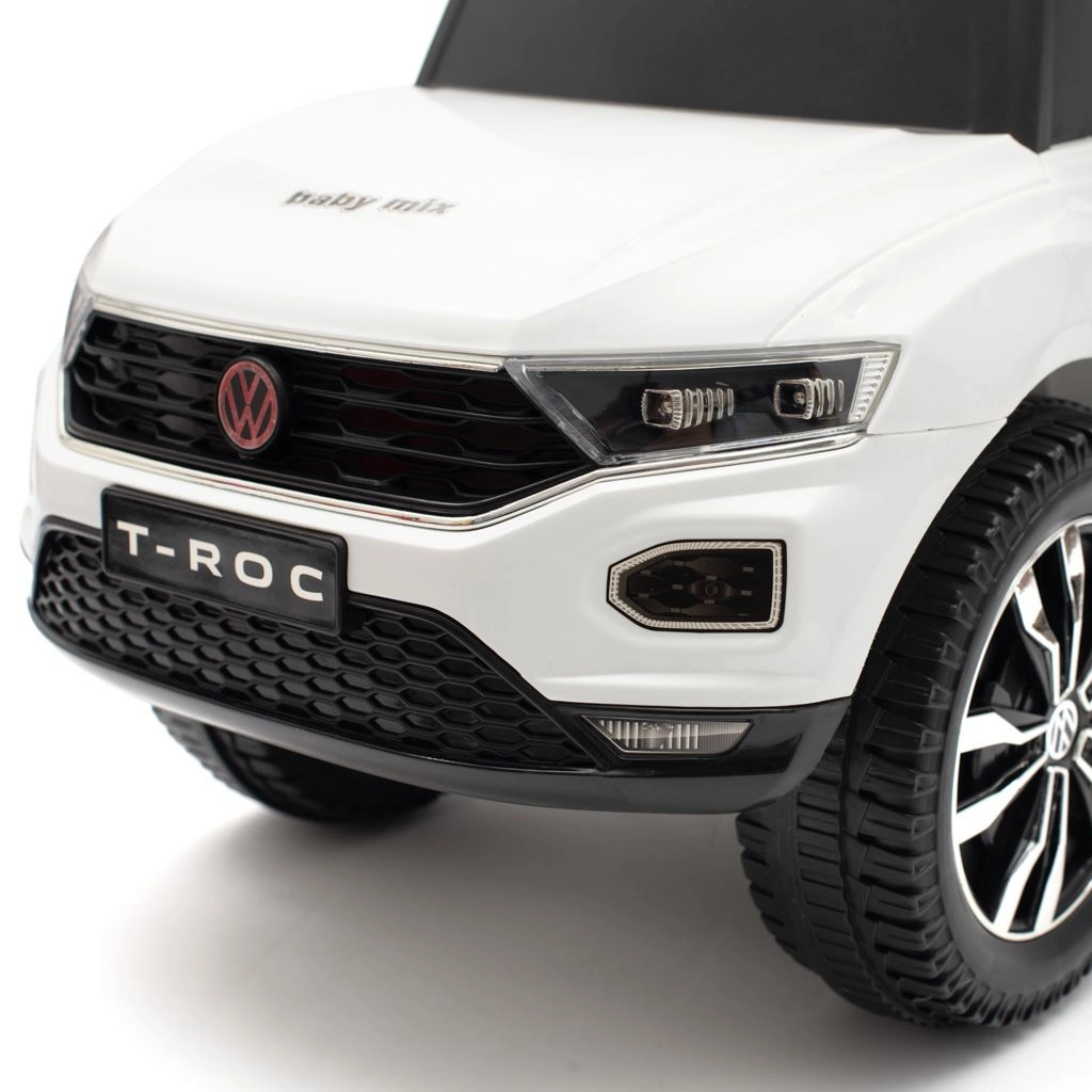 Împingătorul licențiat VOLKSWAGEN T-ROC în culoare albă impresionează prin aspectul realist, calitatea execuției și atenția la detalii. Ajută la dezvoltarea motricității și a echilibrului copilului, oferind totodată o plimbare confortabilă și sigură datorită șezutului lat cu spătar, elementelor de protecție împotriva răsturnării și roților din plastic robuste cu axe metalice.