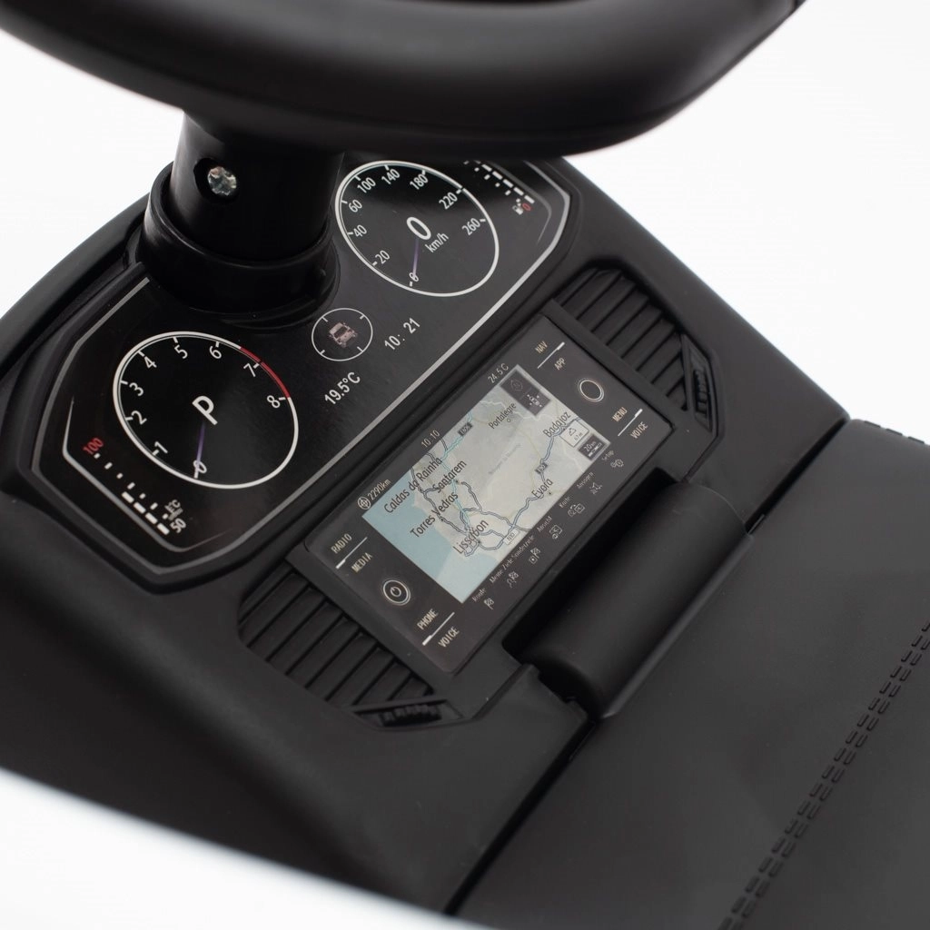 Șezutul lat cu spătar, spațiul de depozitare, suportul pentru băuturi și volanul cu claxon și melodii oferă confort și interacțiune jucăușă.
