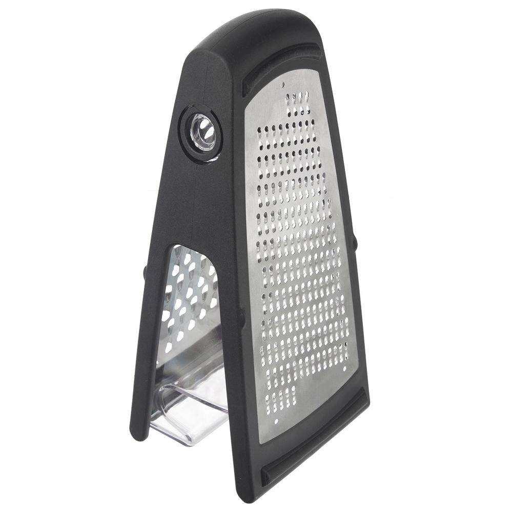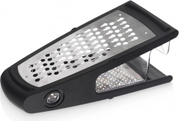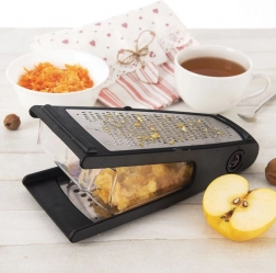 Datorită otelului inoxidabil rezistent și plasticului de calitate, răzătoarea este robustă și totodată ușor de manevrat. Recipientul colectează în siguranță ingredientele răzuite și facilitează transferul lor în bol sau direct în preparat. Răzătoarea este ușor de curățat în mașina de spălat vase, economisind timp și efort.