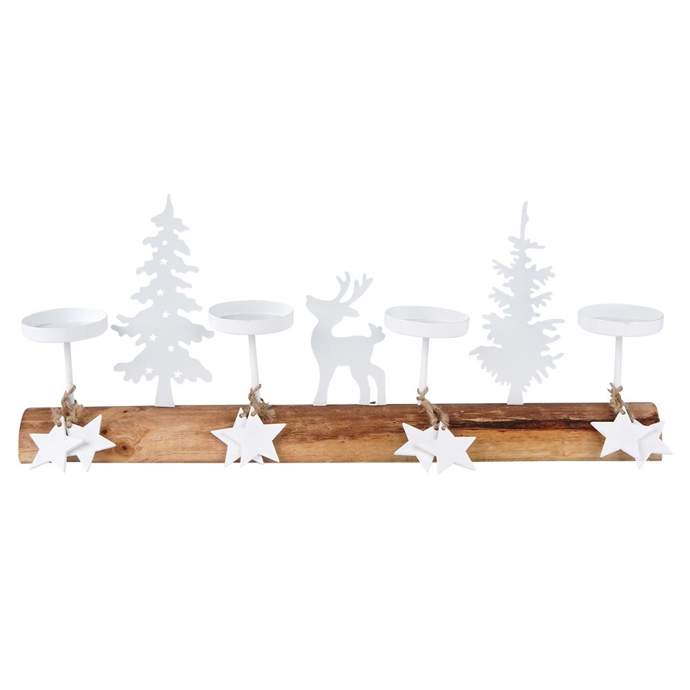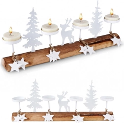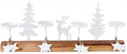 Acest sfeșnic stilat, ce îmbină lemnul natural cu metalul alb mat, este alegerea ideală pentru decorațiunile de iarnă și Crăciun. Siluetele metalice ale brazilor, cerbului și steluțelor suspendate arată spectaculos pe masa din dining, pe comodă sau pe pervaz. Datorită celor patru suporturi, este perfect ca decorațiune de Advent.