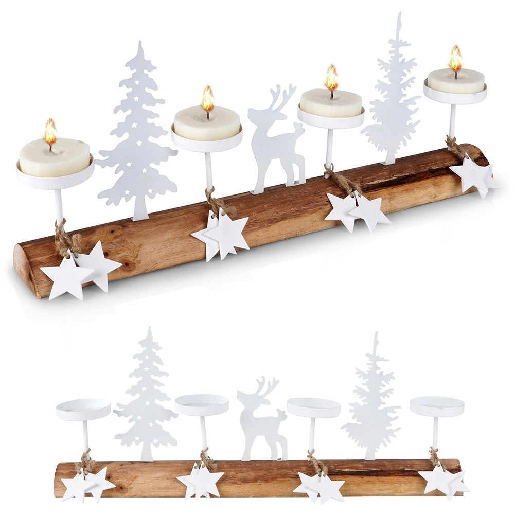 Siluetele decorative și steluțele atârnate subliniază farmecul Crăciunului – ideal ca sfeșnic de Advent pentru masă sau comodă.