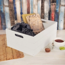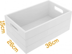 Practică lădiță de depozitare din lemn, în culoare albă, care vă ajută să mențineți ordinea atât acasă, cât și la birou. Are dimensiunile 36 × 26 × 15 cm, este din lemn solid și, datorită mânerelor laterale, se transportă ușor. Este ideală pentru cosmetice, accesorii de birou, accesorii pentru garderobă sau ustensile de bucătărie. Este universală, rezistentă, multifuncțională și totodată decorativă.
