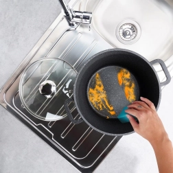 Stratul interior este rezistent, antiaderent și fără PFOA/PTFE. Gătit cu mai puțină grăsime, eliberare ușoară a preparatelor și curățare facilă.