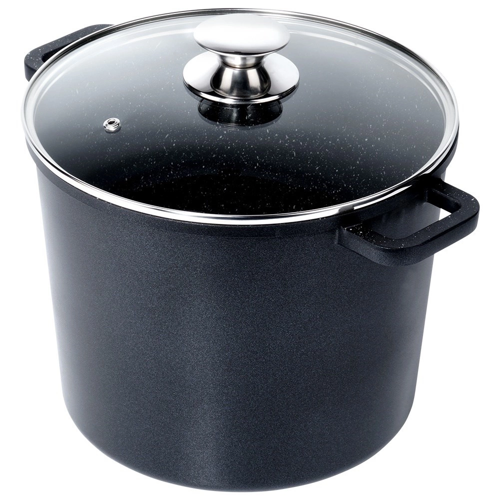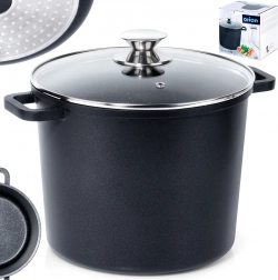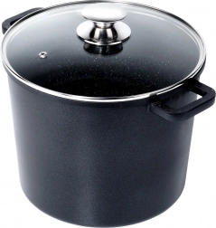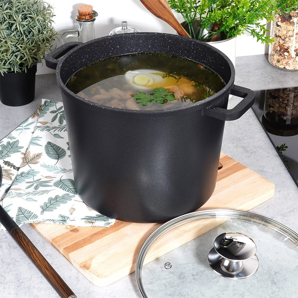 Oala înaltă robustă GRANDE este fabricată din aluminiu durabil, cu strat interior antiaderent din granit PFLUON, rezistent la zgârieturi și temperaturi ridicate. Gătirea este rapidă, uniformă și eficientă energetic – ideală pentru supe concentrate, sosuri și preparate „one-pot”. Capacul din sticlă călită cu margine din inox și supapă de aerisire permite controlul gătirii fără pierderi inutile de căldură.