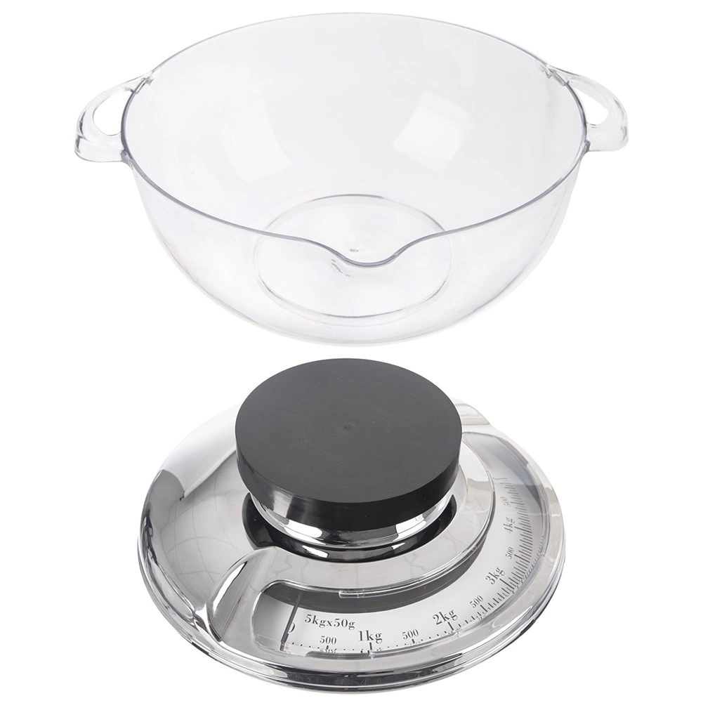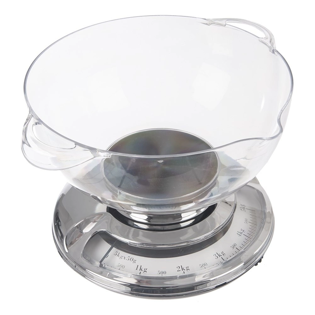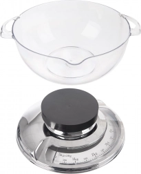Cântarul de bucătărie mecanic, cu bol detașabil și sarcină maximă de 5 kg, este un ajutor de încredere pentru copt și gătit. Oferă măsurare analogică ușor de citit în unități g și kg, gradație precisă și funcționare fără baterii. Bolul încăpător de 2,2 l, cu cioc turnător și mânere, ușurează lucrul, iar padurile antiderapante asigură stabilitatea și protecția blatului de lucru.
