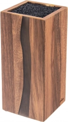 Blocul de cuțite RIVER, stilat și funcțional, este realizat din lemn de salcâm de calitate, cu rășină decorativă care, prin formă, amintește de linia unui râu. Datorită fibrei universale negre din interior, poți introduce cuțite de orice dimensiune și formă, inclusiv ceramice și din oțel, precum și foarfeci sau ustensile de bucătărie mai mici. Inserția fibrelor ține lamele în siguranță, fără fante fixe, și minimizează tocirea taisului.