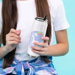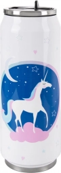 Bucurați-vă de băuturile preferate într-un termos cu motiv vesel de unicorn. Suprafața albă din oțel inoxidabil se potrivește perfect atât în oraș, cât și în natură, iar datorită dimensiunilor compacte de 7 × 19 cm încape în majoritatea suporturilor pentru băuturi. Izolația în vid menține în mod fiabil temperatura dorită pe tot parcursul zilei.