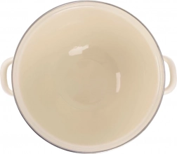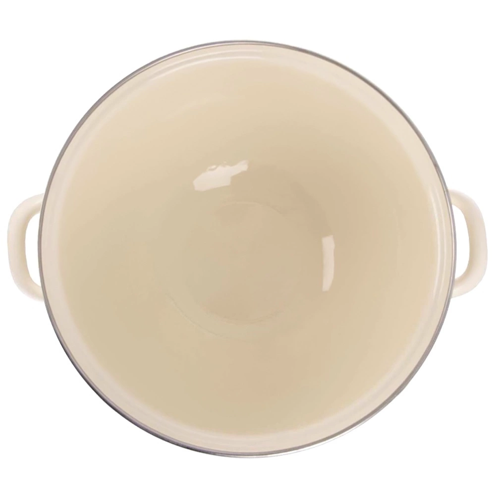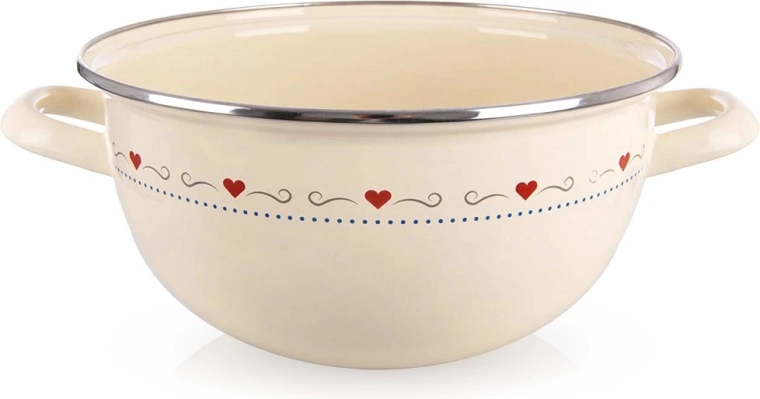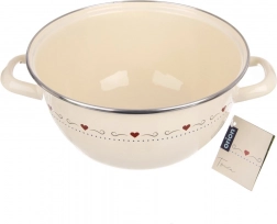 Această bol emailat TONCA cu stil retro este un ajutor excelent în orice bucătărie. Realizată din oțel emailat de calitate, în culoare crem cu motiv discret de inimioare și cu margine din inox pentru o durabilitate sporită. Volumul de 5 l oferă suficient spațiu pentru prepararea porțiilor mai mari, a salatelor sau a aluaturilor. Datorită celor două mânere solide, se transportă confortabil și puteți chiar servi preparatele direct la masă.