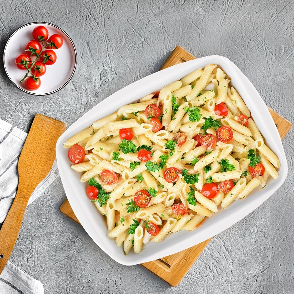 Această tavă încăpătoare din porțelan este o alegere excelentă pentru lasagna, cartofi gratinați, legume, carne și deserturi. Suprafața interioară netedă asigură scoaterea ușoară a preparatelor și curățarea comodă. Datorită designului alb, atemporal, puteți servi preparatele direct pe masă, cu stil.