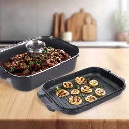 Set universal pentru gătit zilnic: tavă încăpătoare de 7 l cu capac sub formă de tigaie grill și capac separat din sticlă termorezistentă cu dozator pentru condimente lichide. Stratul dublu din granit PFLUON GRANIT pe corpul din aluminiu turnat asigură o aderență redusă excelentă, distribuție uniformă a căldurii și curățare mai ușoară.