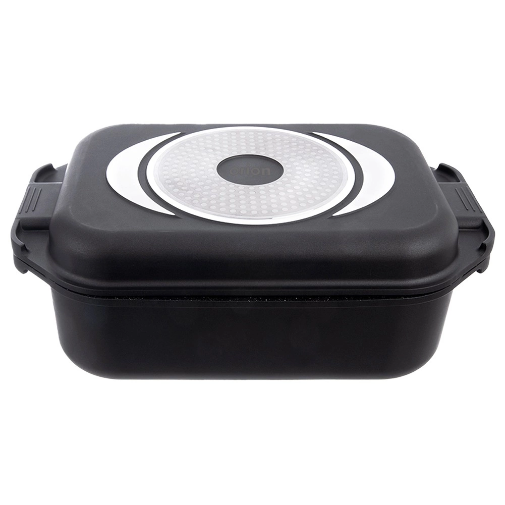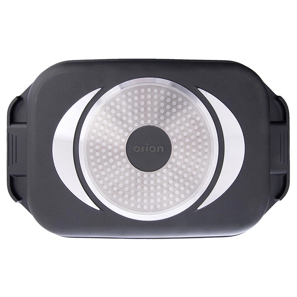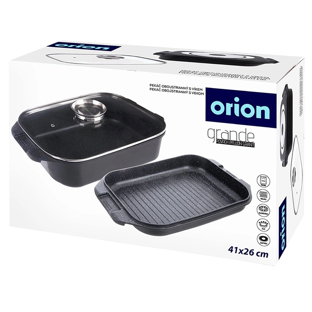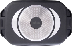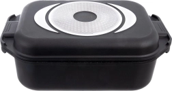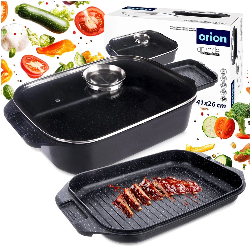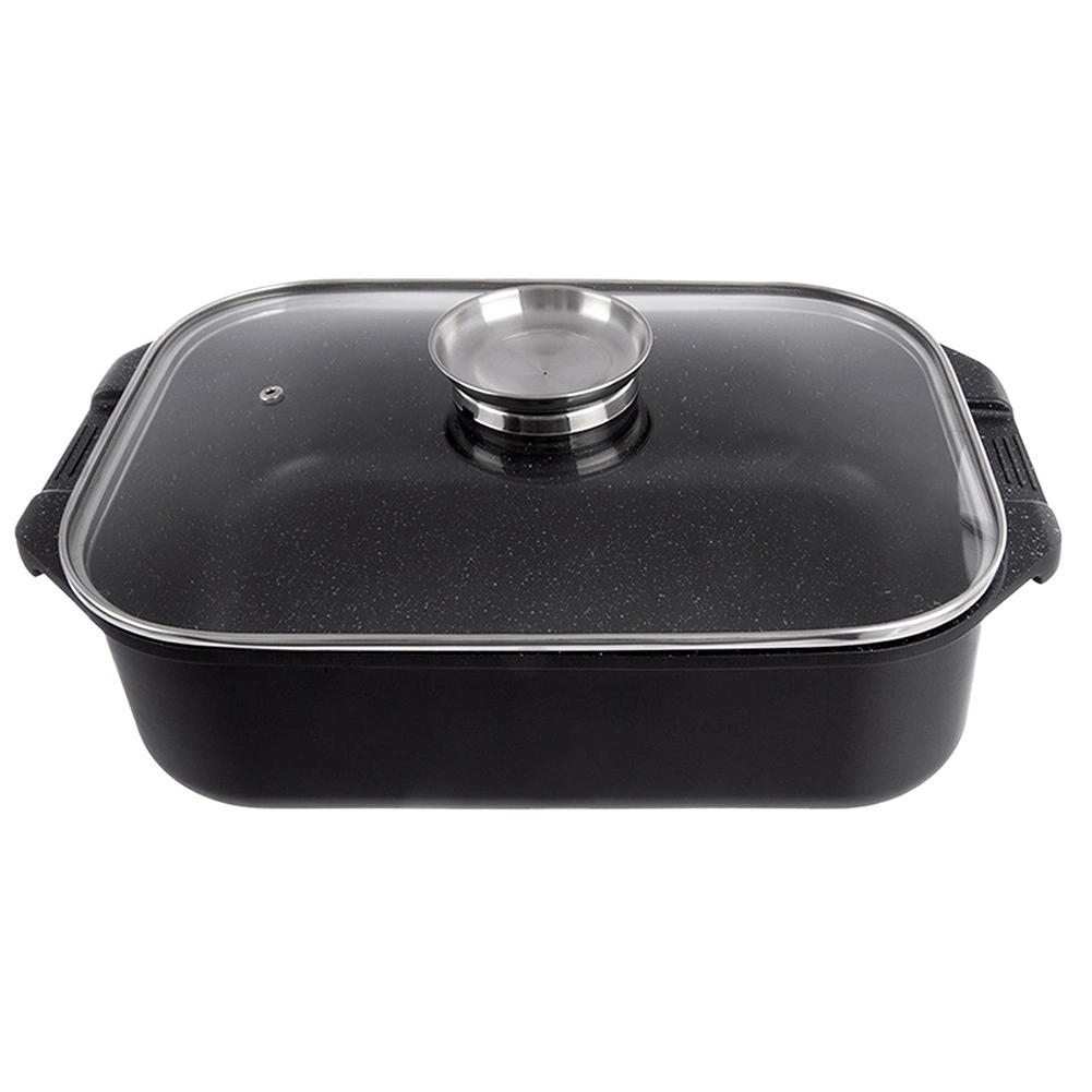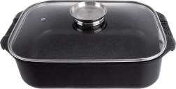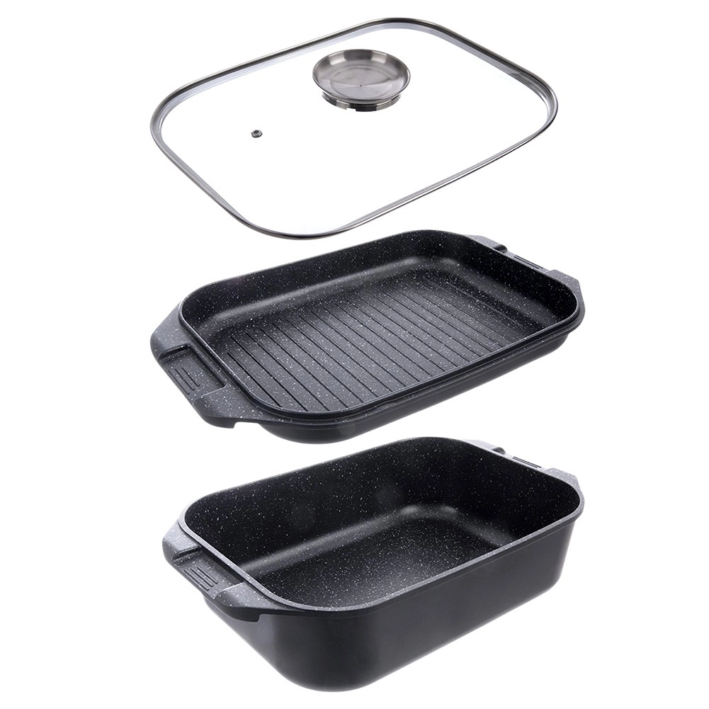 Tavă romană multifuncțională din granit 3în1 pentru copt, înăbușit și prăjit, cu volum de 7 l. Include tigaie grill folosită ca capac și capac din sticlă termorezistentă cu dozator. Corp turnat din aluminiu, rezistent, cu dublu strat antiaderent din granit PFLUON GRANIT, permite gătitul cu minimum de grăsime și acumulează excelent căldura. Potrivită pentru gaz, electric, ceramic și inducție, la cuptor până la 230 °C (cu capacul de sticlă până la 200 °C) și se poate spăla în mașina de spălat vase.