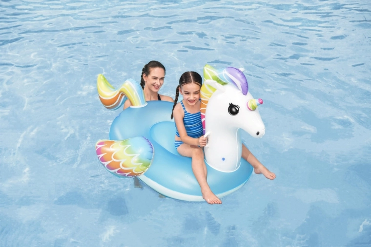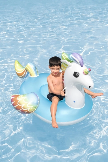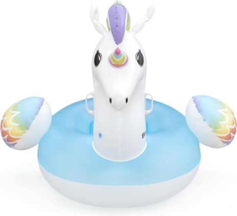 Unicornul gonflabil Bestway încântă prin culori curcubeu vii și scaunul albastru confortabil. Datorită bazei late și celor două mânere solide, copiii se simt în siguranță și confortabil la joacă în apă. Materialul PVC de calitate rezistă utilizării zilnice, ca să te bucuri de vară fără griji.