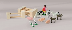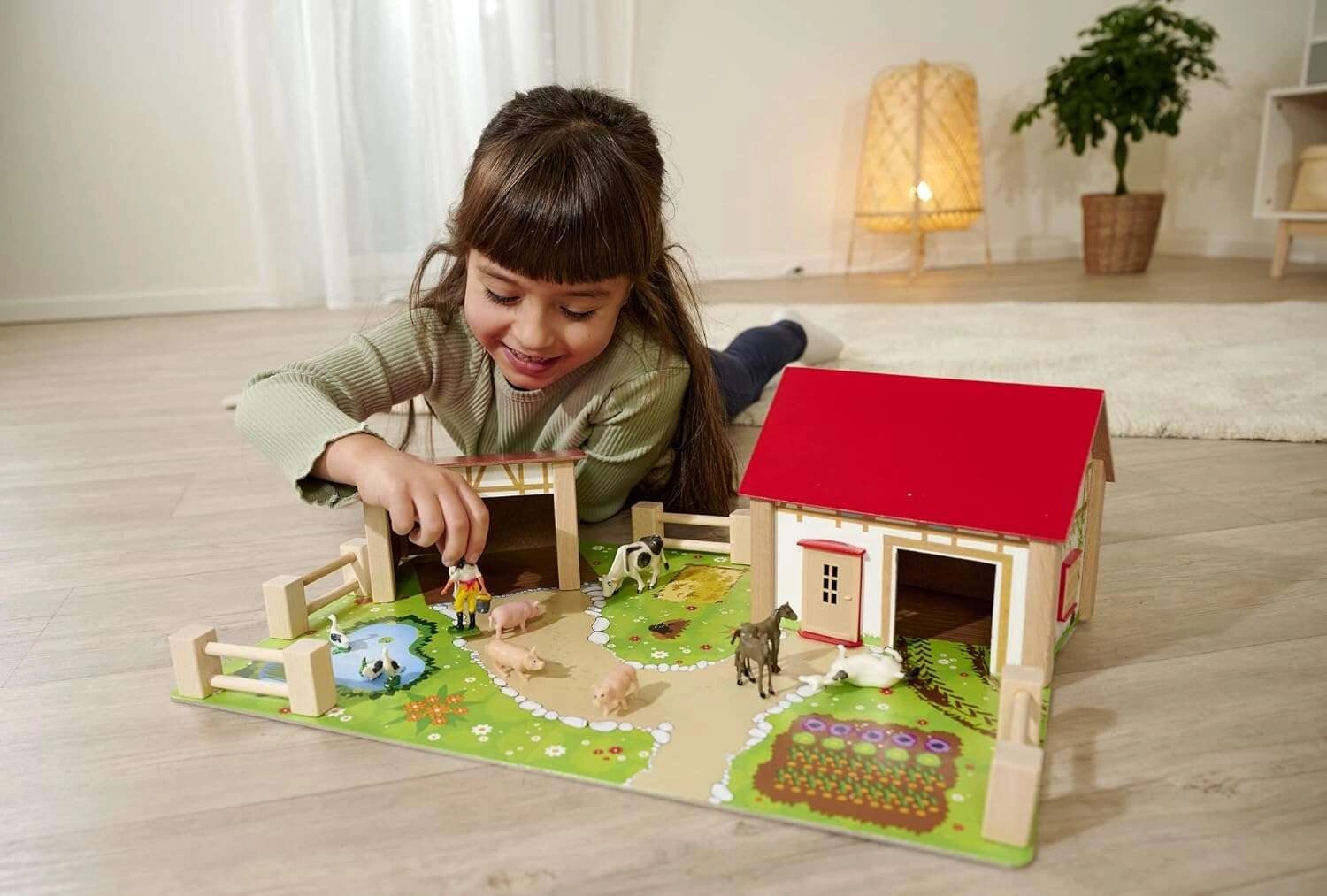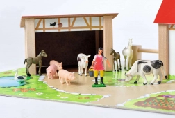 Setul include o casă mare cu incintă și staul, bază colorată 51 × 36 cm, garduri și 12 figurine de animale și fermier. Jucăria susține coordonarea, învățarea culorilor și formelor și familiarizarea cu animalele domestice.