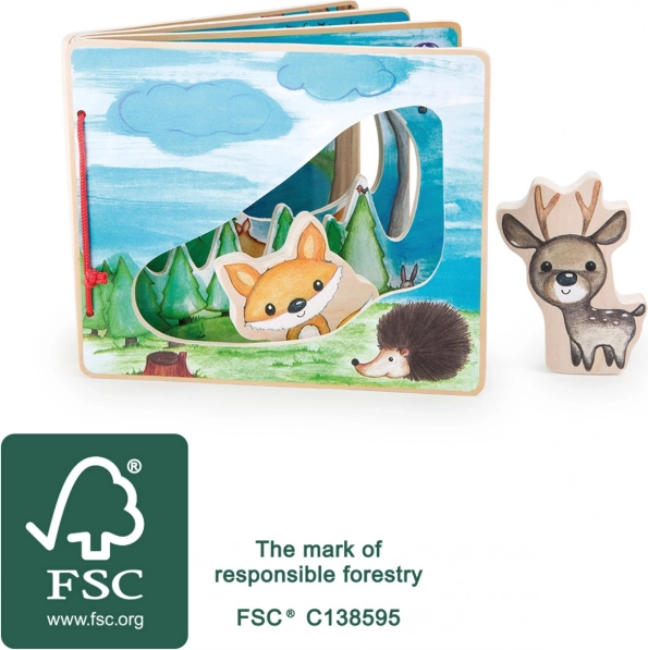 Intrați în pădurea adâncă cu această carte interactivă din lemn care stimulează imaginația copiilor. Datorită figurinelor vulpii și cerbului, care ajută la descoperirea florei și faunei, fiecare joc devine o experiență unică.