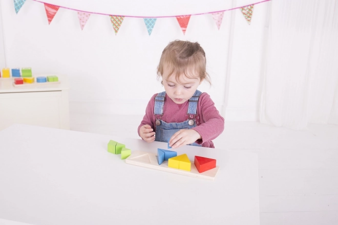 Formele simple și culorile vii (roșu, albastru, verde, galben) susțin percepția vizuală și clasificarea logică. Introducerea pieselor în pozițiile corespunzătoare întărește asocierea corectă.