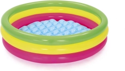 Piscina ușoară și compactă, cu diametrul de 102 cm și înălțimea de 25 cm, este o alegere excelentă pentru copii de la 2 ani. Trei inele colorate, cu valve separate, asigură stabilitate și siguranță la joacă, în timp ce fundul gonflabil oferă confort suplimentar chiar și pe suprafețe mai dure. Capacitatea de 62 de litri este potrivită pentru o răcorire plăcută și primele jocuri cu apă.