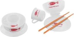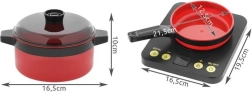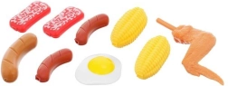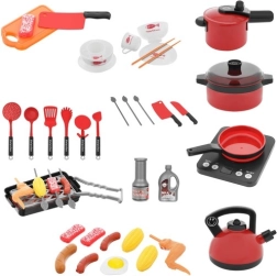 În pachet găsiți, printre altele, grătar cu grătar metalic, aragaz cu inducție, oală sub presiune și oală, tigaie, ceainic, tocător și cuțite sigure, ustensile (polonice, spatule, clești), veselă (boluri, farfurii, căni) și „alimente” și condimente pentru un joc realist.